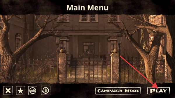 2、进入Main Menu主菜单,背景为阴森房屋场景,点击右下角PLAY按钮,可开始游戏战役模式,开启冒险旅程。