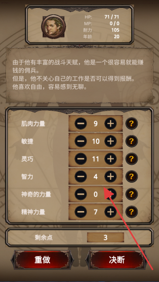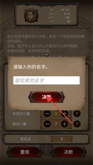 1、创建角色时,分配属性点如按职业需求加智力、力量等,剩余点合理分配,点击决断确认,完成创建。