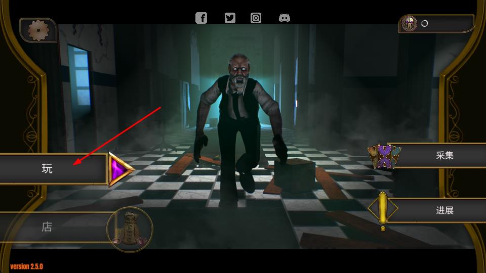 1、游戏启动在主界面点击左侧带紫色三角装饰的玩按钮,进入弥漫烟雾、黑白格地板的阴森场景,正式开启恐怖解谜冒险。