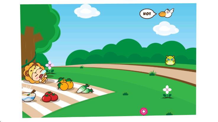 3、在关卡操控小狮子角色,沿箭头方向前进,收集金币,注意躲避或击败右侧绿色怪物,推进关卡。