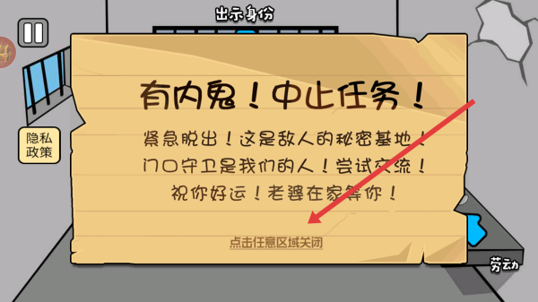 2、在剧情弹窗处点击任意区域关闭提示,获知需紧急脱出敌人秘密基地,且门口守卫为己方,准备与之交流推进逃脱。