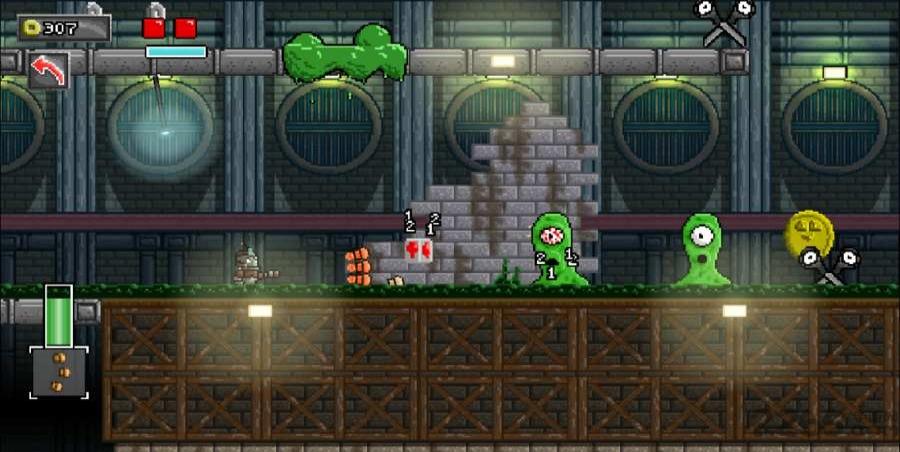 3、探索工厂的区域,收集金币来提升分数,击败关卡Boss如绿色罐子怪,推进流程,解锁新场景和能力。
