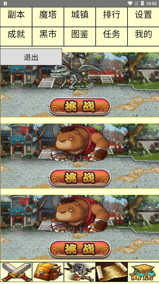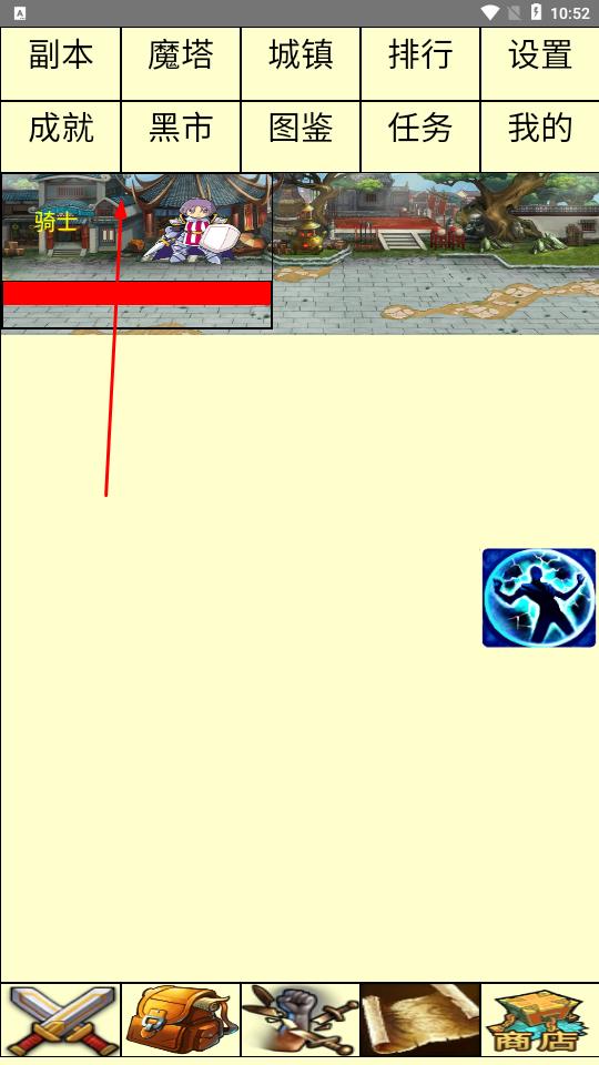 3、进入城镇界面,通过顶部菜单副本、魔塔等及底部功能按钮,管理角色、参与玩法,玩家就可以看冒险进程。