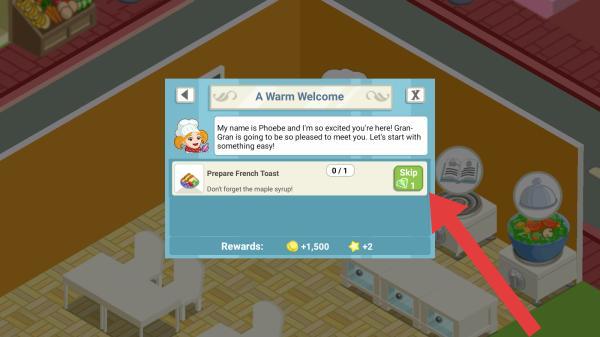 1、画面呈现了欢迎语以及告知玩家我们所需要制作的菜品,可根据提示进行操作,点击Skip进行跳过。