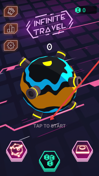 1、点击TAP-TO-START”,进入Infinite-Travel游戏,操控球形角色开启穿梭挑战,初始界面功能按钮可后续探索,先聚焦启动游戏。