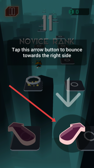 2、新手阶段跟随提示,点击右侧箭头按钮,让角色向右侧弹跳,借助平台推进,熟悉操作逻辑,逐步提升跳跃节奏,应对Novice-Rank关卡考验。