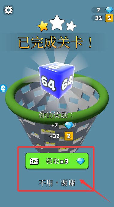 3、通关后弹出奖励界面,可选观看广告获取丰厚奖励或直接领取基础收益。