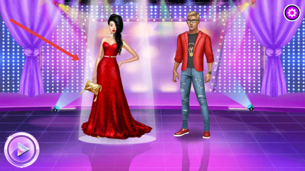 3、为角色搭配服饰,如女性的红色长裙与手包、男性的潮流穿搭,完成后在派对舞台展示精心设计的时尚造型。