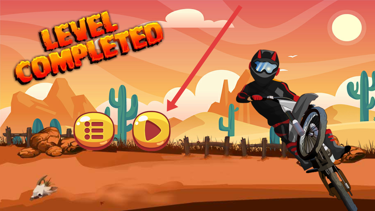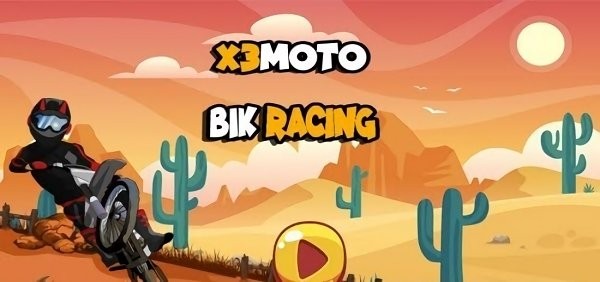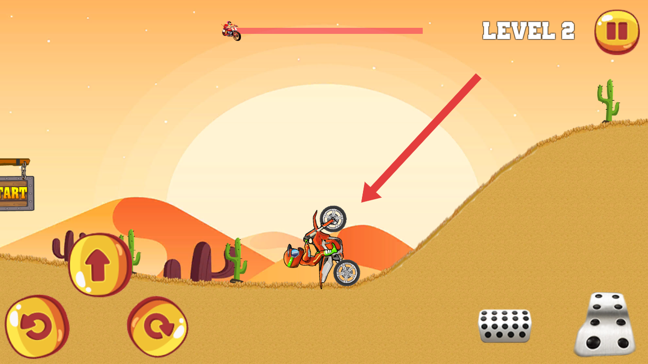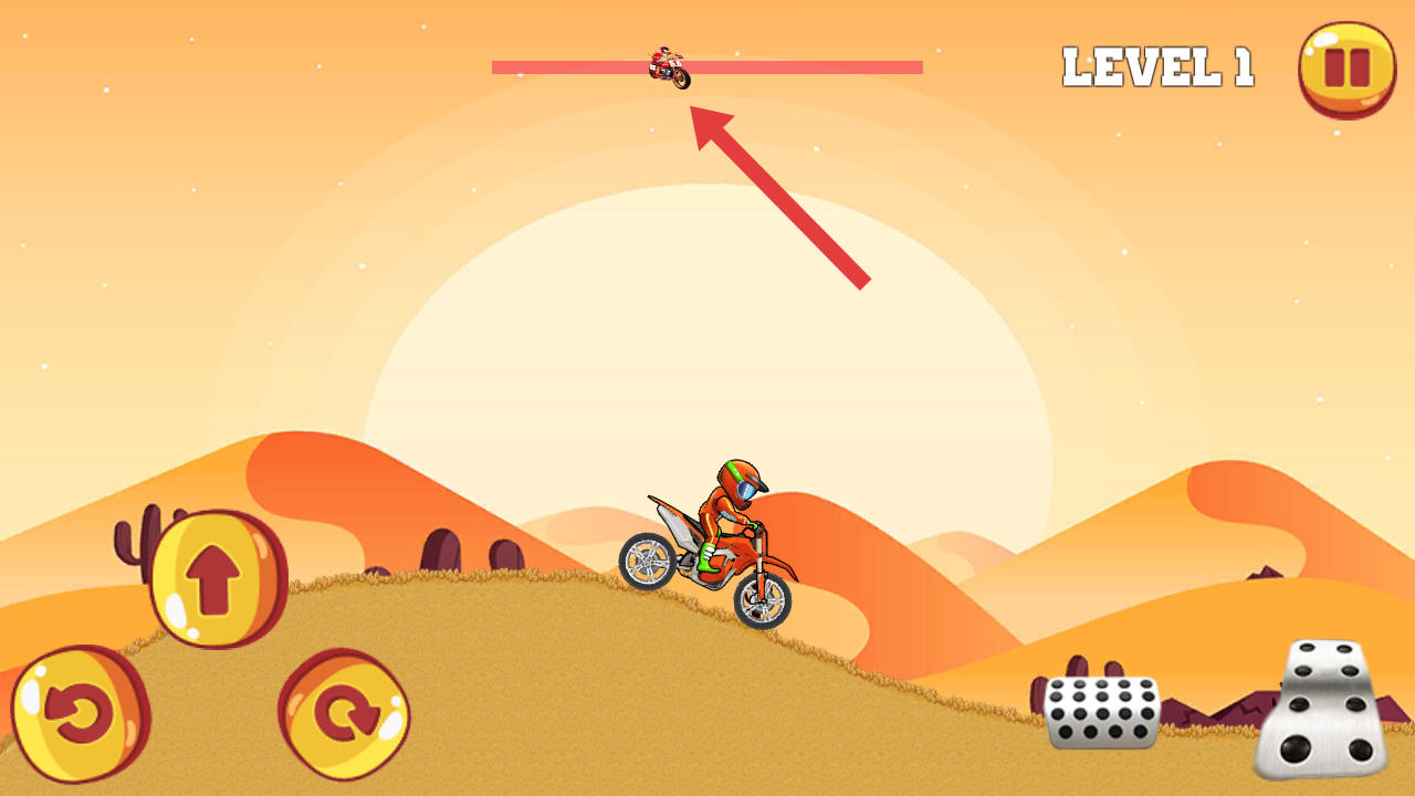 1、操控橙色摩托,点击左下角按钮加速,沿着沙漠地形爬坡,向最前方的终点区域前进,可以查看头上的赛道进程。