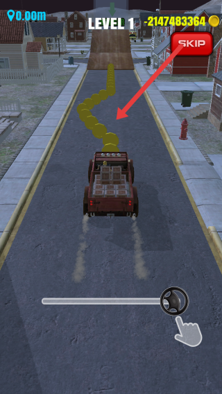 1、开局驾驶红色卡车沿着道路上的黄色金币轨迹行驶,通过虚拟方向盘操控方向,尽可能的多收集金币。