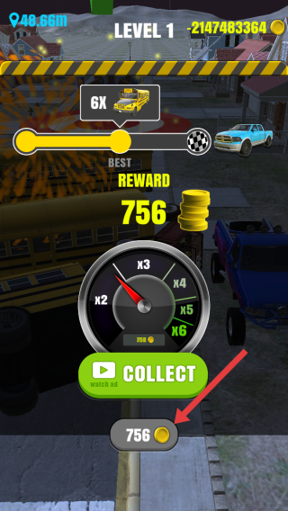 3、关卡结束后,点击显示756金币的按钮,领取奖励金币,可以用于后续车辆升级和开局购买道具。
