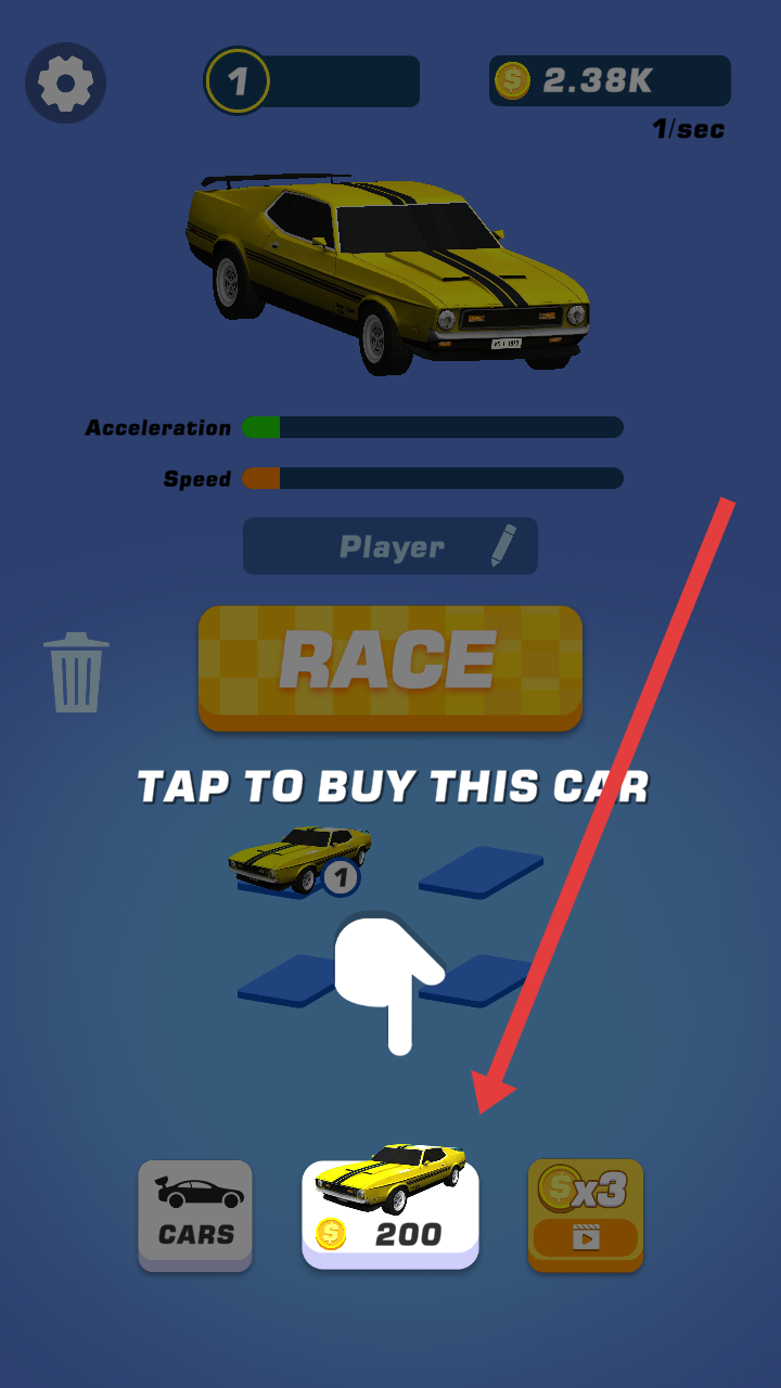 1、在车辆界面,点击底部标有200金币的黄色汽车图标,消耗金币购买该车辆,扩充车库的库存。