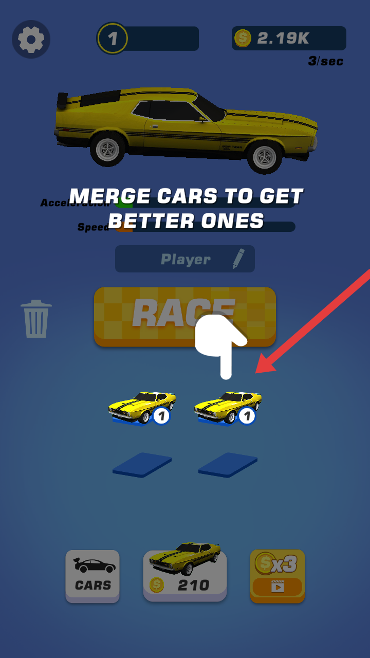 2、将两辆相同的黄色汽车拖至同一空位,遵循MERGE CARS TO GET BETTER ONES的规则,合成更高级车辆。
