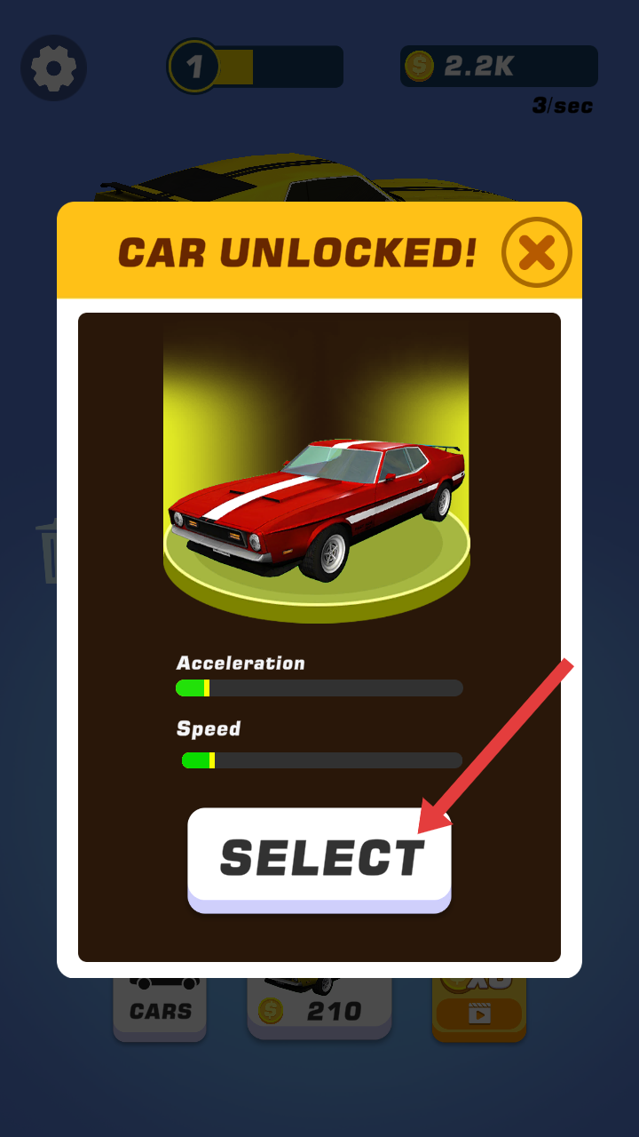 3、解锁红色新车辆后,点击弹窗内的SELECT按钮,选定这个新车作为参赛的车辆,提升竞速性能。