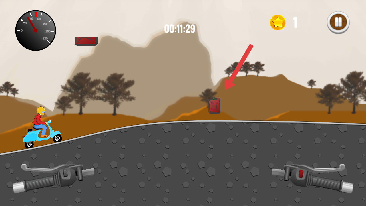 2、驾驶摩托车行驶时,靠近红色油桶并拾取,借助下方模拟车把控件调节车速,补充燃油以可以维持接下来的路程。