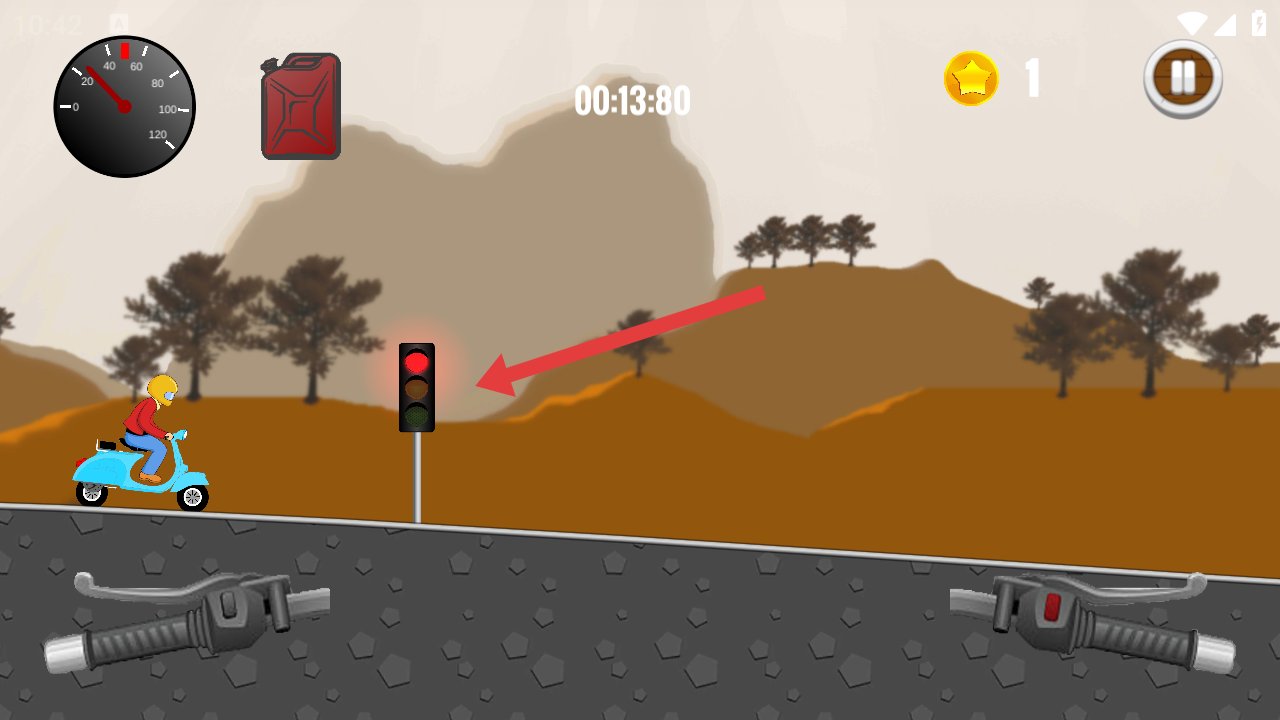 3、当行驶至红色交通信号灯处,操作左侧模拟刹车把手减速,使摩托车平稳停靠等待,待信号灯变化后再通过右侧油门把手启动。