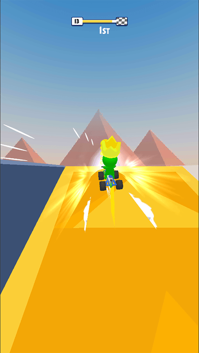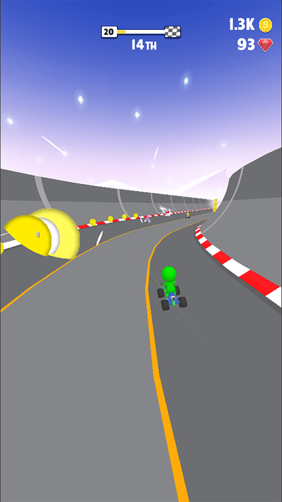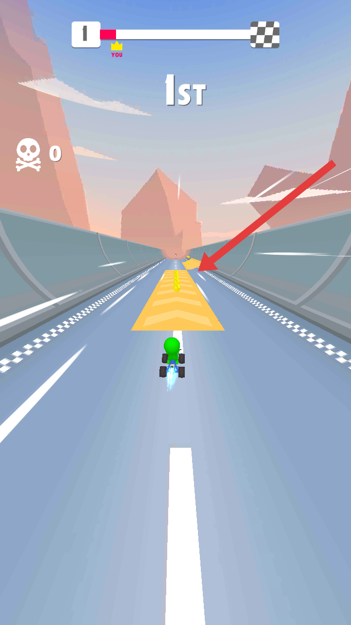 1、驾驶赛车沿着黄色的加速带行驶,收集路径上的金币,借助加速效果提升车速,巩固领先位置。