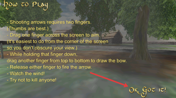 2、阅读玩法说明两指操作射箭、拖移手指瞄准、拉弓及注意风速等,点击Ok,Got it,进入射箭场景。