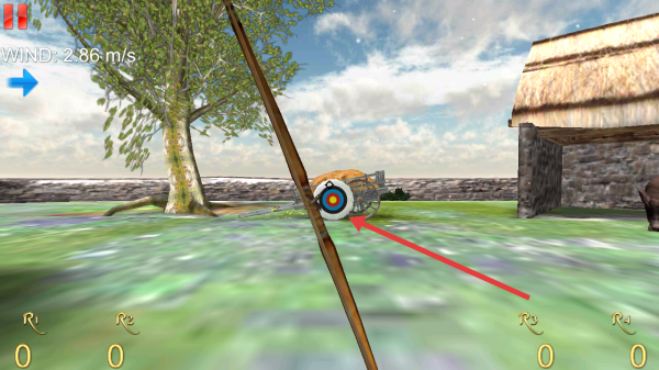 3、在场景中,依据风速,如2.86m/s,用两指按教程瞄准靶心,把控拉弓、释放时机,尝试射中目标,提升命中精度。
