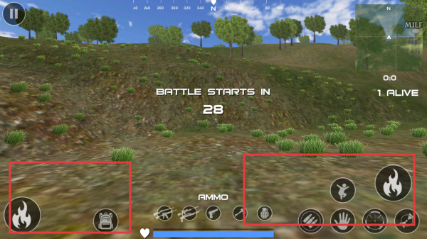 3、进入战场后,熟悉红框内动作按钮如火焰图标等,利用它们进行移动、交互,倒计时结束前找掩体,为战斗做准备,争取存活到最后。