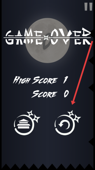 3、游戏结束后,点击右侧重玩按钮,重新挑战Dark-Ninja,尝试突破当前分数,提升忍者跳跃生存的时长。