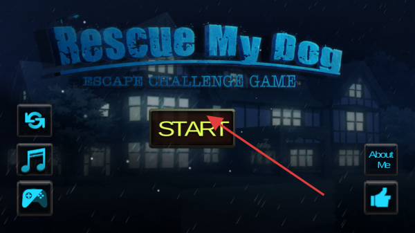 1、进入Rescue My Dog游戏,点击START按钮,开启救援狗狗的密室逃脱挑战,身处雨夜房屋场景,准备解谜。