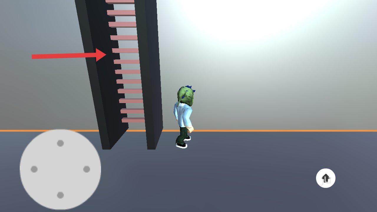 1、开局进入游戏,需要操控角色靠近前面的红色楼梯,需要沿着楼梯向上越过,进入娃娃头的场景。