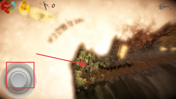 2、游戏中,用左侧摇杆控制角色移动,在山地场景探索,留意生命值、金币,收集资源,推进流程。