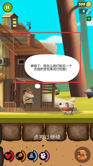 1、游戏开场,跟随老人对话,接找球任务,点按继续,推进剧情,解锁挖掘玩法。