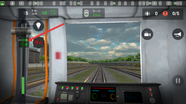 3、出车站后,保持自动驾驶,根据界面时速15千米/小时 、剩余距离324m,监控轨道状况,确保列车按规行驶。