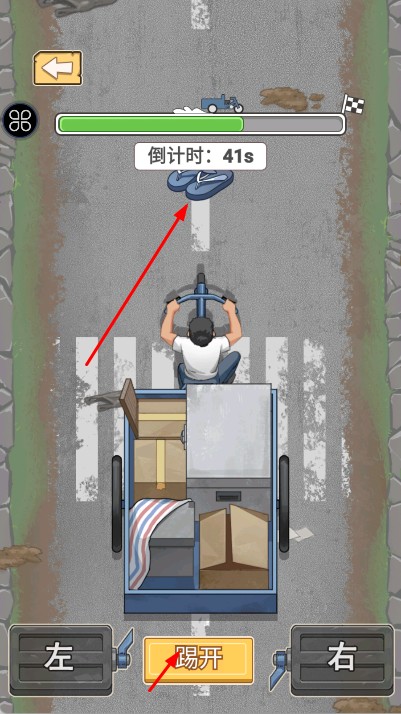2、点击出门,在城镇场景按指引前往地点,参与三轮货运任务,根据提示操作左,右,踢开按钮,躲避障碍、完成运输。