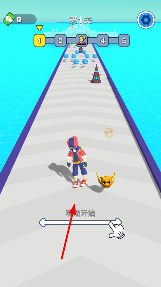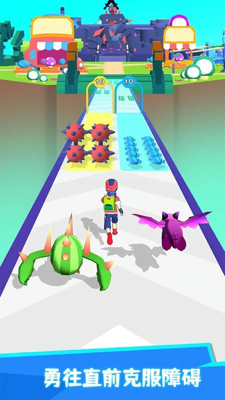 2、参与酷跑闯关模式,操控精灵在赛道上奔跑,躲避障碍物并收集道具,同时与途中的野生精灵对战,获胜后有机会将其收服。
