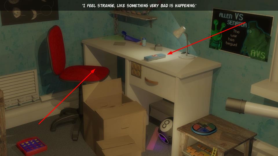 3、在房间场景内,识别红色座椅、桌面物品等可交互元素,点击红色椅子、桌上物件完成互动操作,同时关注上方文字提示,结合互动行为与文字提示,逐步推进剧情解谜。
