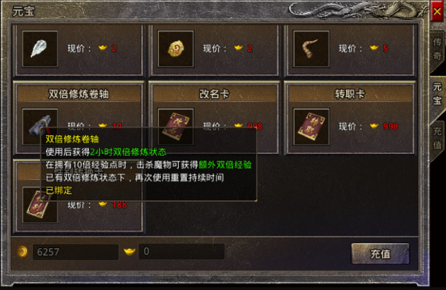 那么这时候就去商城元宝处购买一个双倍修炼卷轴,该卷轴能使打怪被10倍经验点加成获取的10倍经验再次翻倍。通俗点说就是,在有10倍经验点的且有双倍的状态下是获取20倍的打怪经验。