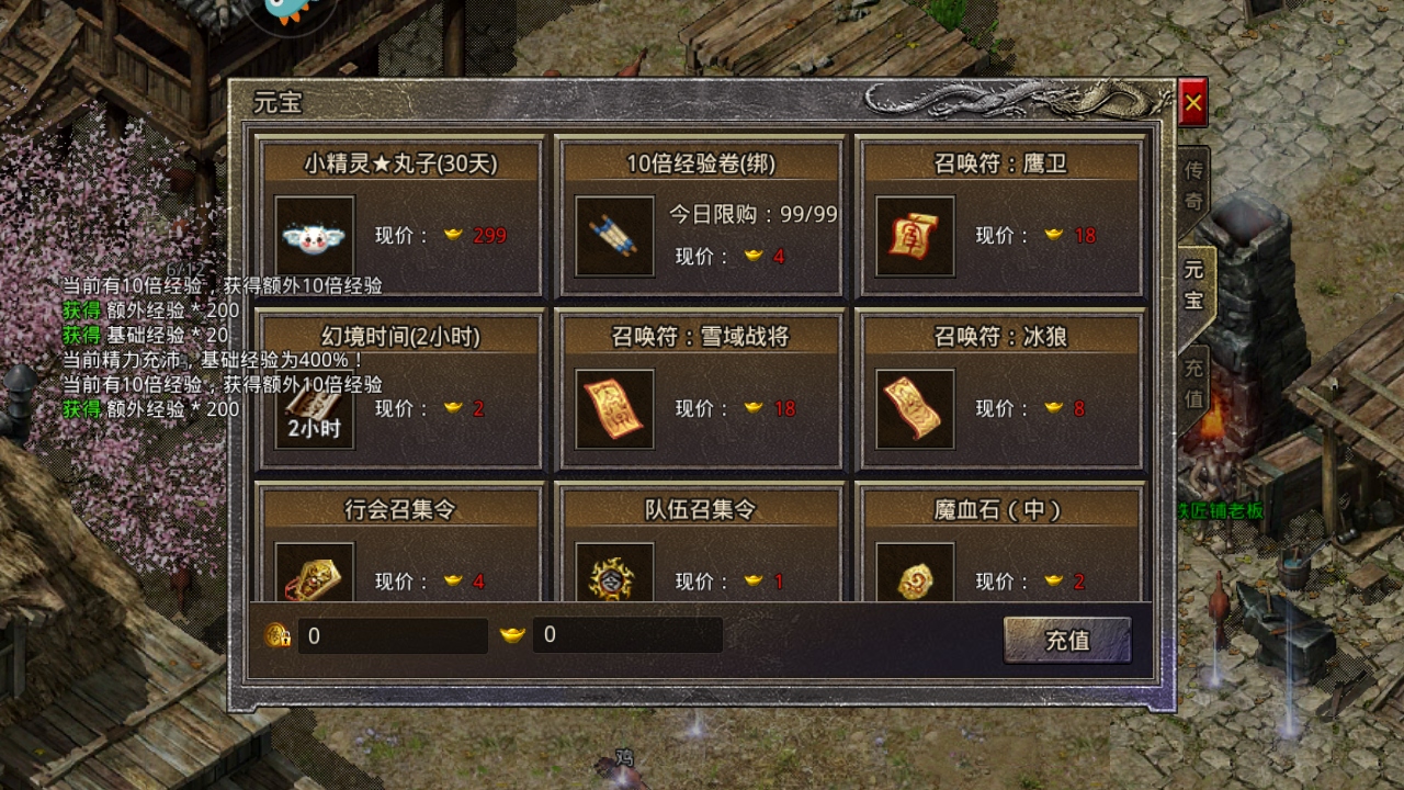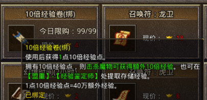 虽然有了双倍修炼卷轴但是我们的10倍点依旧很少,所以我们需要去购买一些10倍经验卷(绑),自然10倍经验卷是越多越好,所以需要把这99个都给买了。