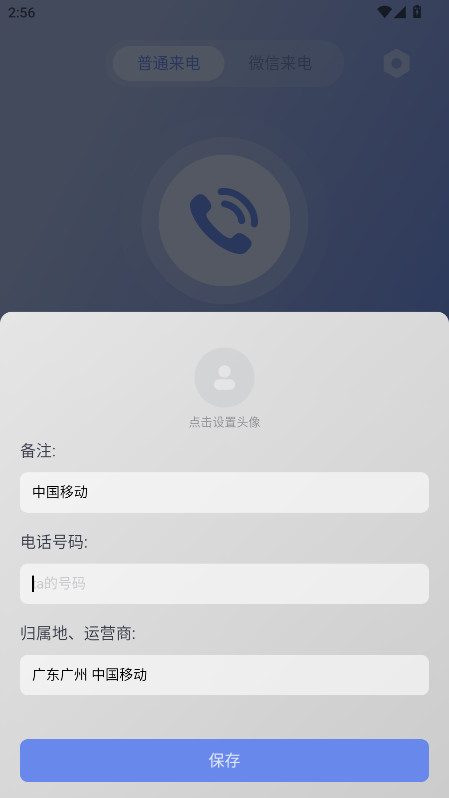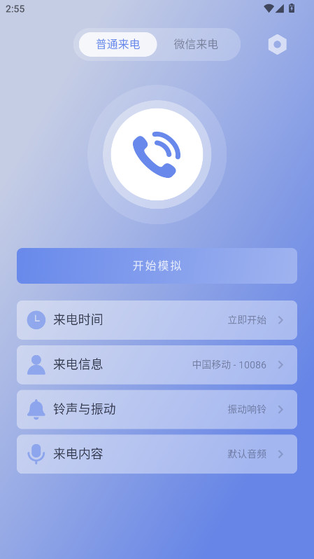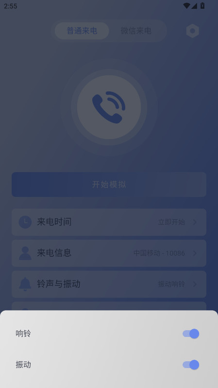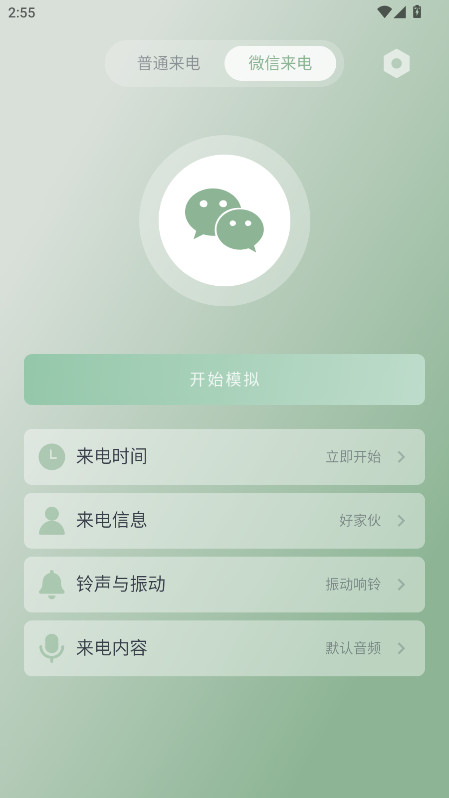1、打开软件在页面可以进行各种参数的设置,自由选择或者点击普通来电或者微信来电。