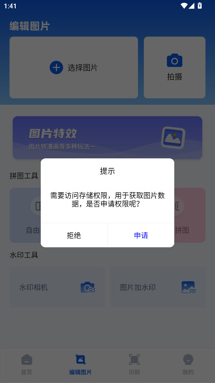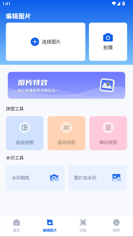 2.在编辑图片板块,主要有编辑图片、拼图工具、水印工具等板块内容,大家可以按需点击使用哈。