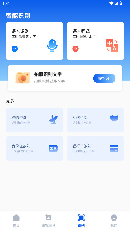 3.在识别板块,主要有智能识别、植物识别、动物识别、身份证识别等小功能,大家可以自由点击使用。