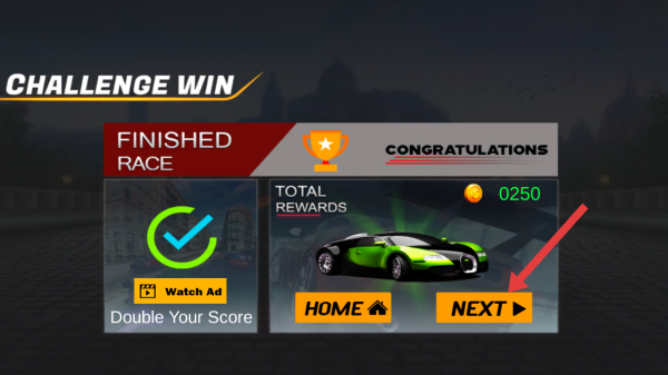 3、挑战胜利后,在CHALLENGE WIN界面,点击橙色NEXT按钮,领取250金币奖励,进入下一轮赛道挑战。