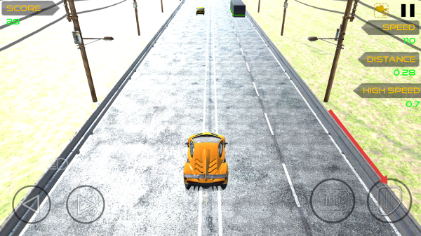 1、进入游戏场景,用左下角方向键控制黄色赛车左右变道,躲避前方车辆,紧盯右侧速度,距离等数据。