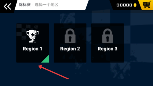 1、在锦标赛选地区界面,点击解锁的Region1,进入该地区赛事,开启拉力赛车挑战。