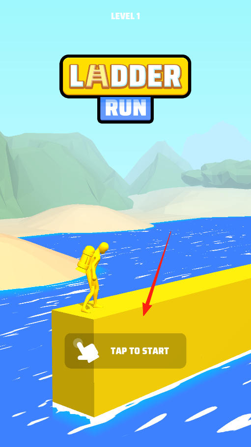 1、进入游戏第一关,看到黄色小人站在河边平台,点TAP TO START ,让小人开始跑酷,准备在黄色路径上前进,遇到缺口得想办法搭桥,开启这场过河挑战。