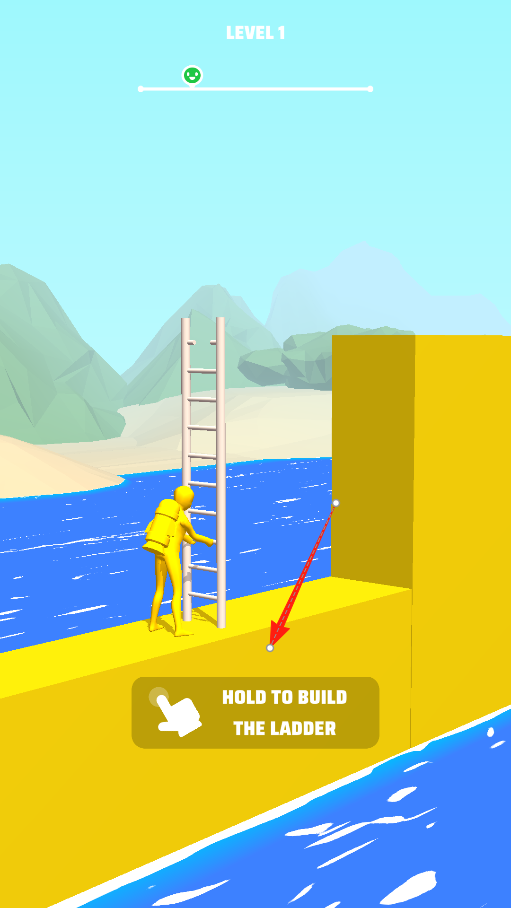 2、小人跑起来后,遇到需要搭桥的地方,出现梯子,按住HOLD TO BUILD THE LADDER按钮,给梯子延长搭到对面平台,让小人通过梯子过河,把握好搭建长度。