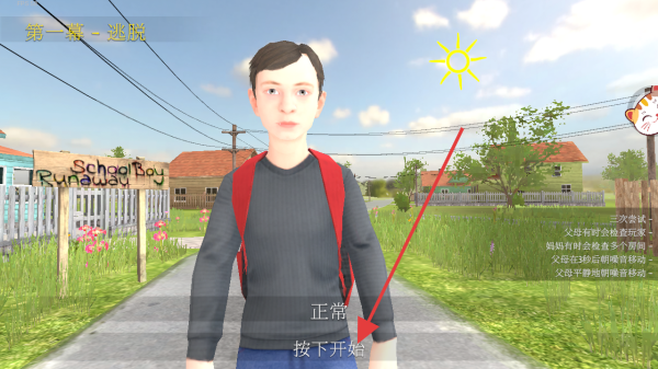 1、进入游戏第一幕“逃脱”场景,点击按下开始,操控背着红色书包的角色,在School Boy Runaway小镇环境中开启冒险。