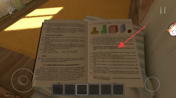 2、游戏中来到房间场景,观察桌上打开的书本,留意箭头指向的文字与立体图形题目区域,收集线索、破解谜题。