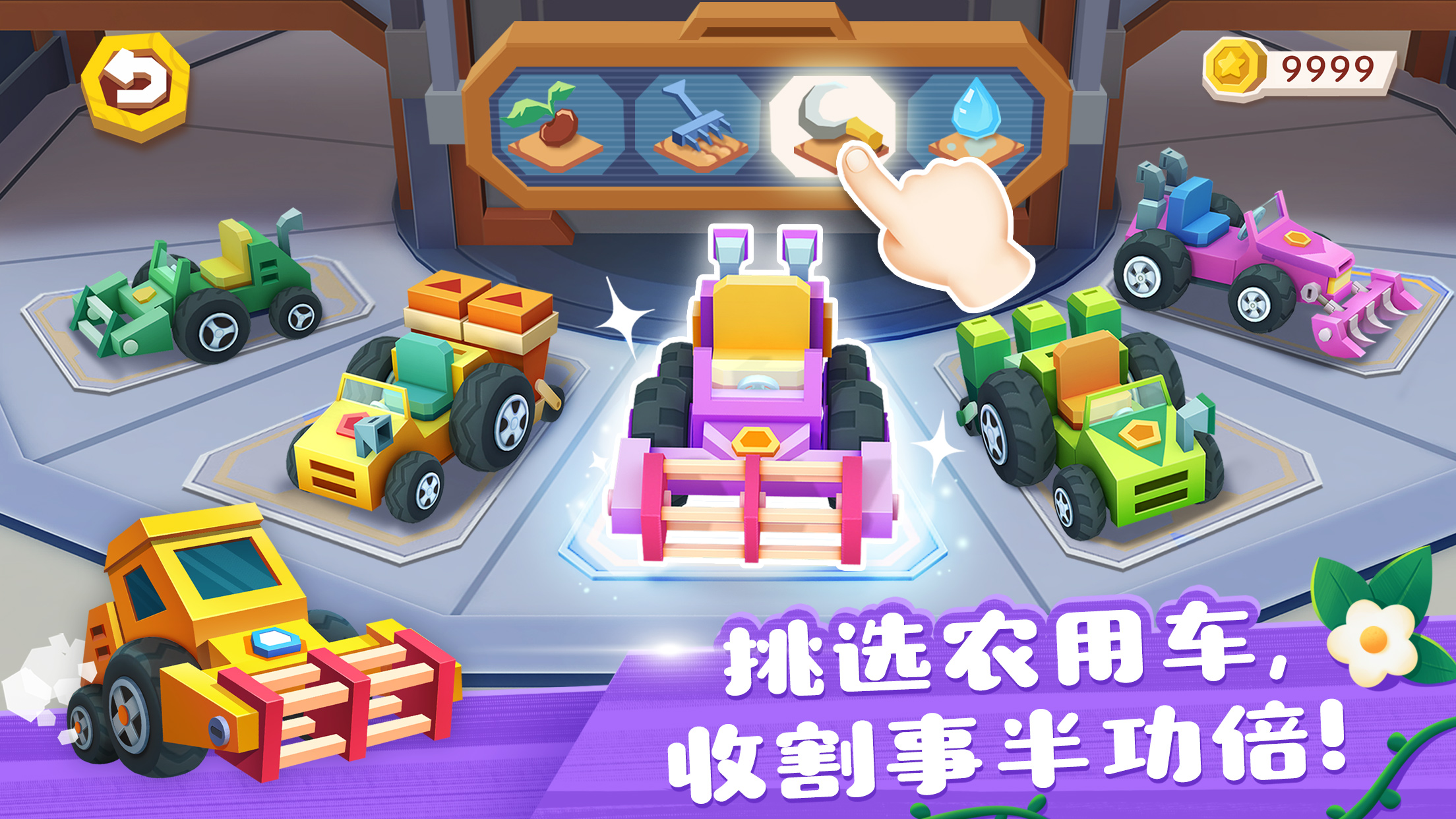 - 咦?还有些土地尚未开垦,宝宝们快驾驶农用车向前,开垦耕地!种植范围扩大,如果人手不够,宝宝们还可借用播种机、洒水车等进行耕种,这样效率会更高哦!(认识农用车)