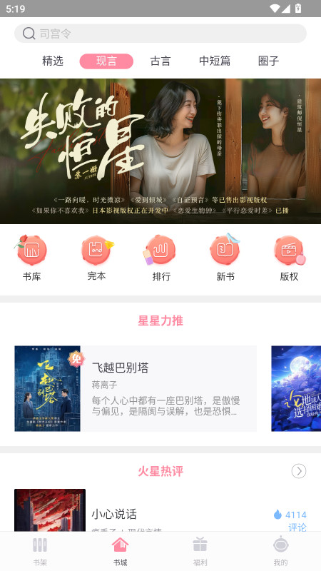 5.在书城板块,有很多的板块内容,比如书库、完本、排行、精品等。