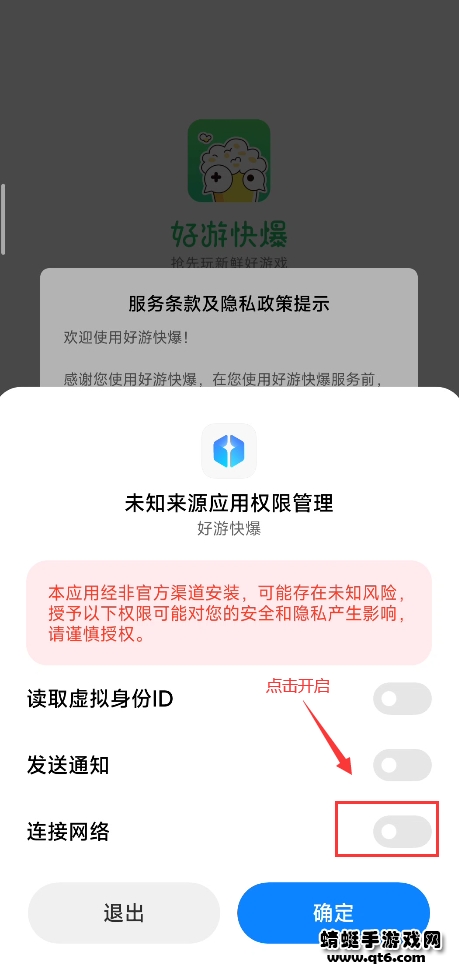①首次安装打开快爆时,会弹出以下权限管理,将“连接网络”权限开启即可~
