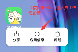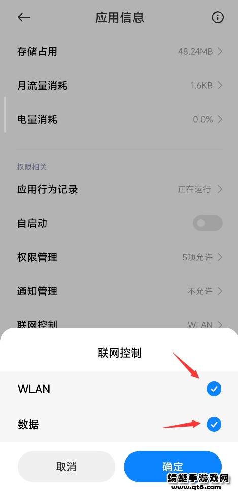 ②在手机桌面长按快爆图标,进入应用信息,将“联网控制”中的使用wifi和数据权限打开即可~