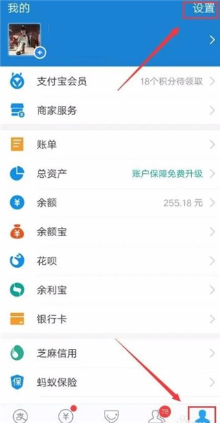 第一步,打开我们的支付宝,选择我的界面,点击“设置”。如下图所示:
